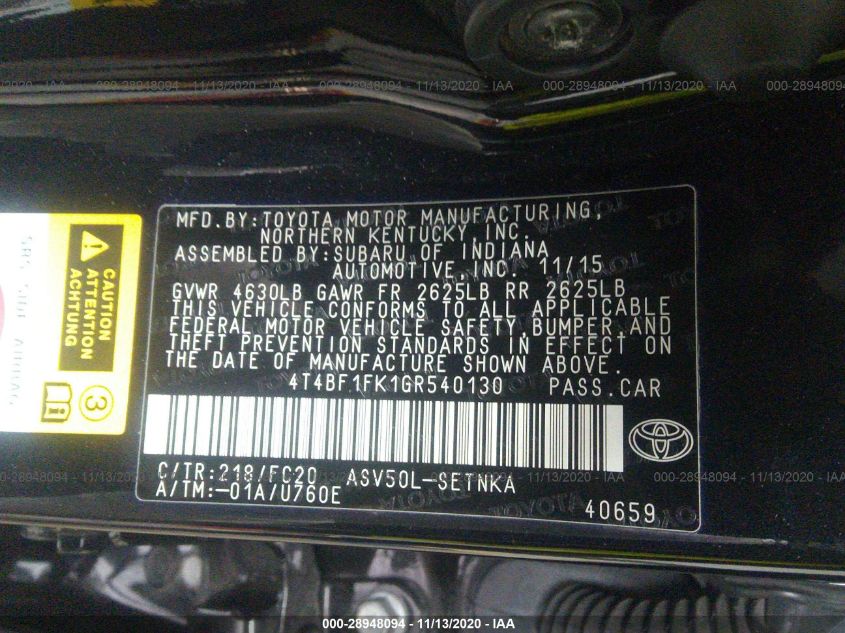 2016 TOYOTA CAMRY Front Wheel Drive
