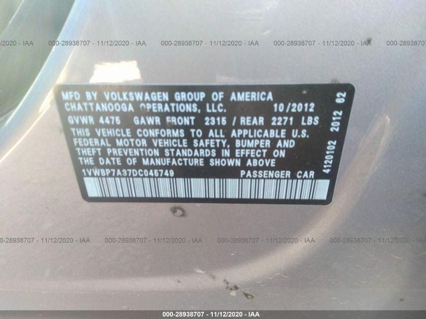 2013 VOLKSWAGEN PASSAT Front Wheel Drive