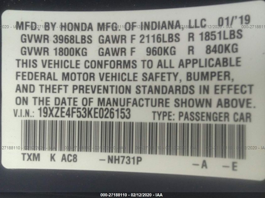2019 HONDA INSIGHT Front Wheel Drive