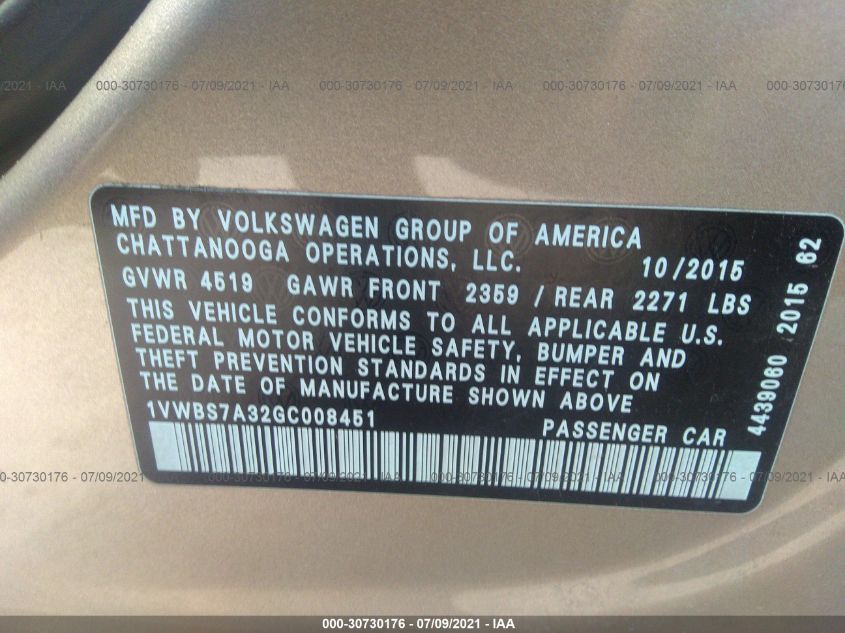 2016 VOLKSWAGEN PASSAT Front Wheel Drive