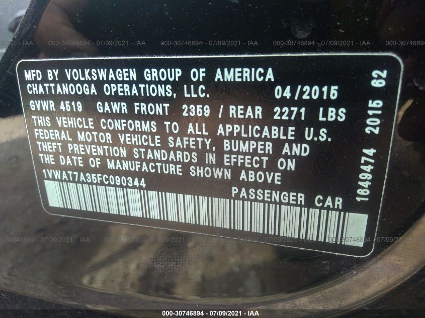 2015 VOLKSWAGEN PASSAT Front Wheel Drive