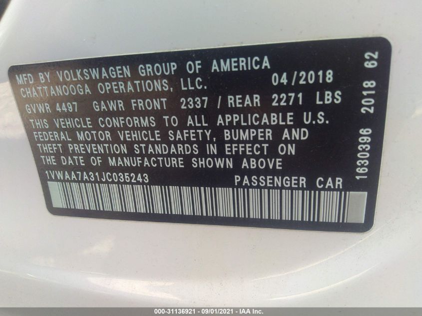 2018 VOLKSWAGEN PASSAT Front Wheel Drive