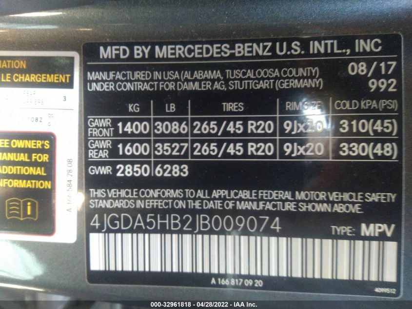 VIN 4JGDA5HB2JB009074